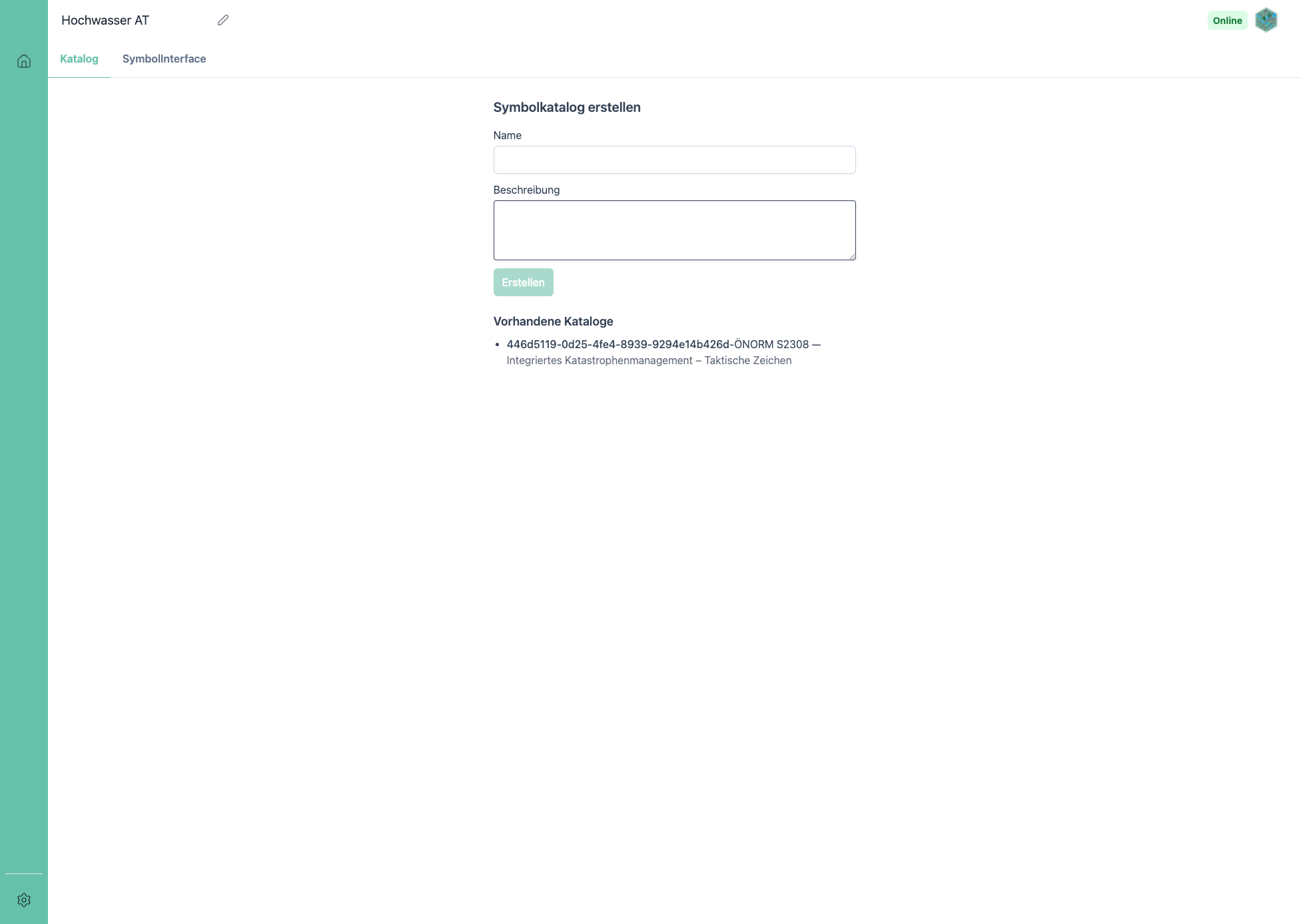 Abschnitt mit dem Titel „Symbolkatalog“Der Symbolkatalog dient als Container für thematisch zusammengehörige Taktische Zeichen und Symbole. Bevor einzelne Symbole hochgeladen werden können, muss ein entsprechender Katalog existieren.