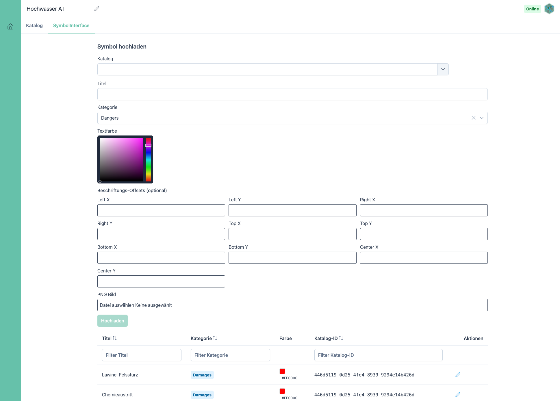 - Titel & Textfarbe: Benennung des Symbols und Auswahl der Farbe für die Beschriftung in der Karte mittels Farbwähler.