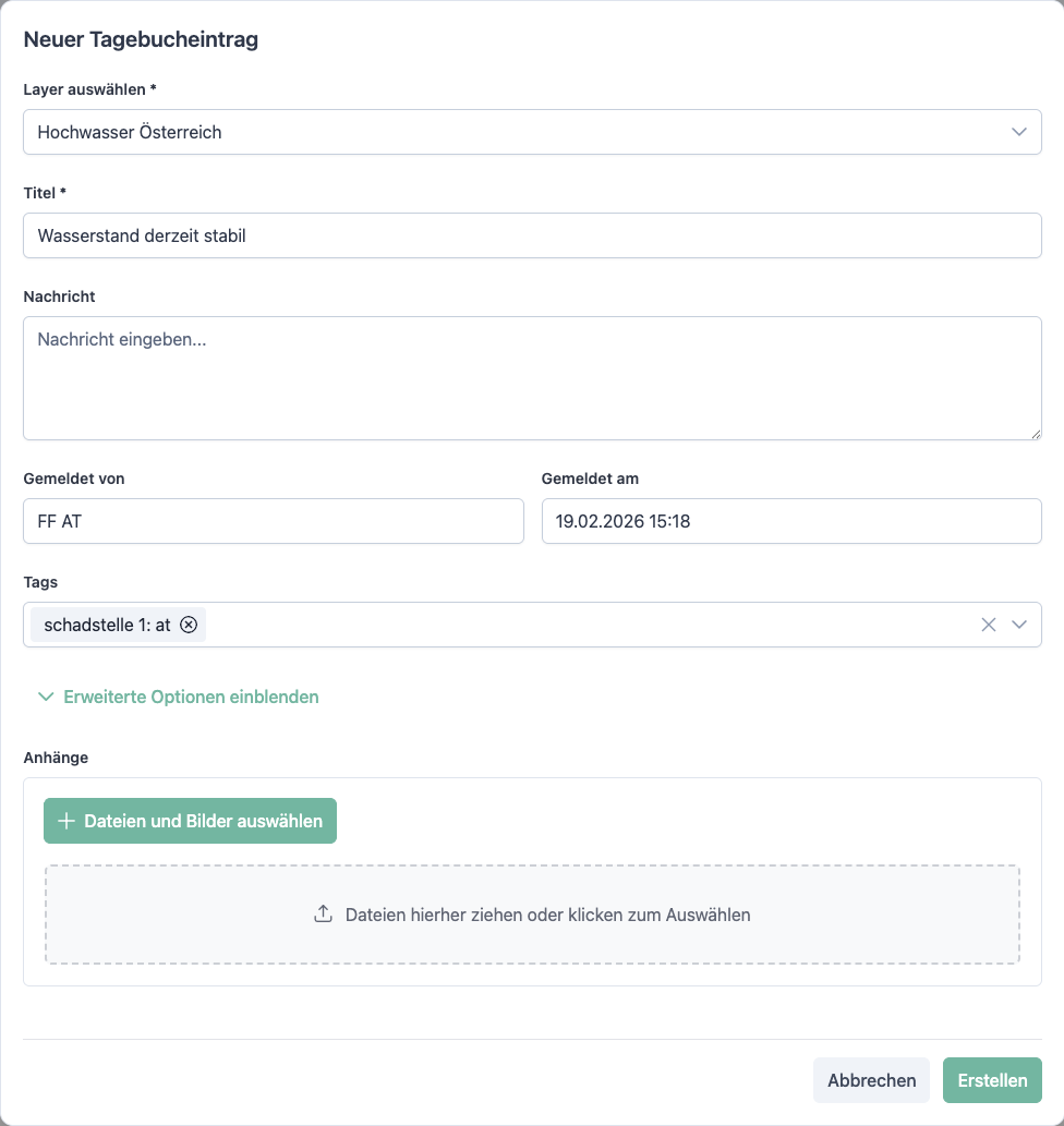 Abschnitt mit dem Titel „Neuer Tagebucheintrag“Ein neuer Eintrag kann sowohl direkt im Modul Einsatztagebuch als auch über das Register Tagebuch in der Lagekartenansicht erstellt werden.