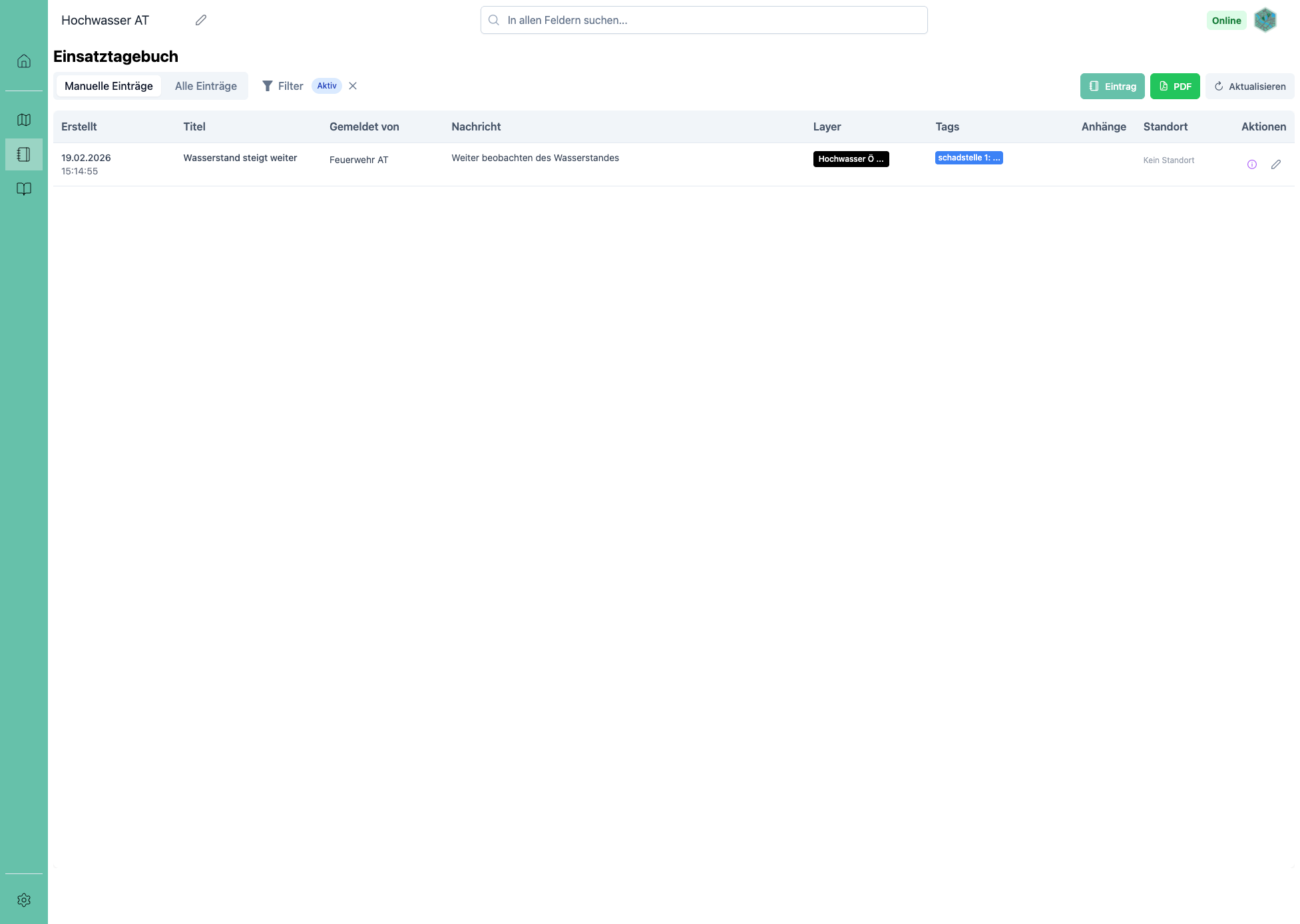 Abschnitt mit dem Titel „Export und Druck (PDF)“Für die Archivierung oder die Übergabe an andere Stabsstellen kann das Einsatztagebuch jederzeit als PDF exportiert werden.