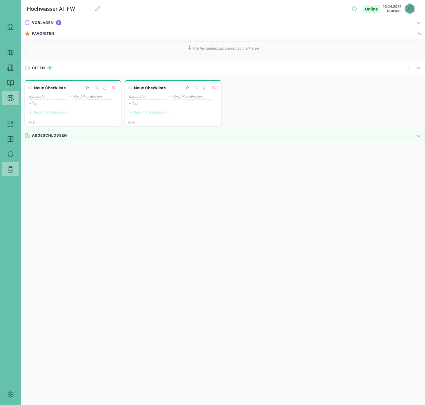 Abschnitt mit dem Titel „Favoriten“Checklisten, die als Favorit markiert wurden, erscheinen in der Sektion Favoriten am oberen Seitenrand. Checklisten können durch Drag & Drop in den Favoriten-Bereich gezogen werden.