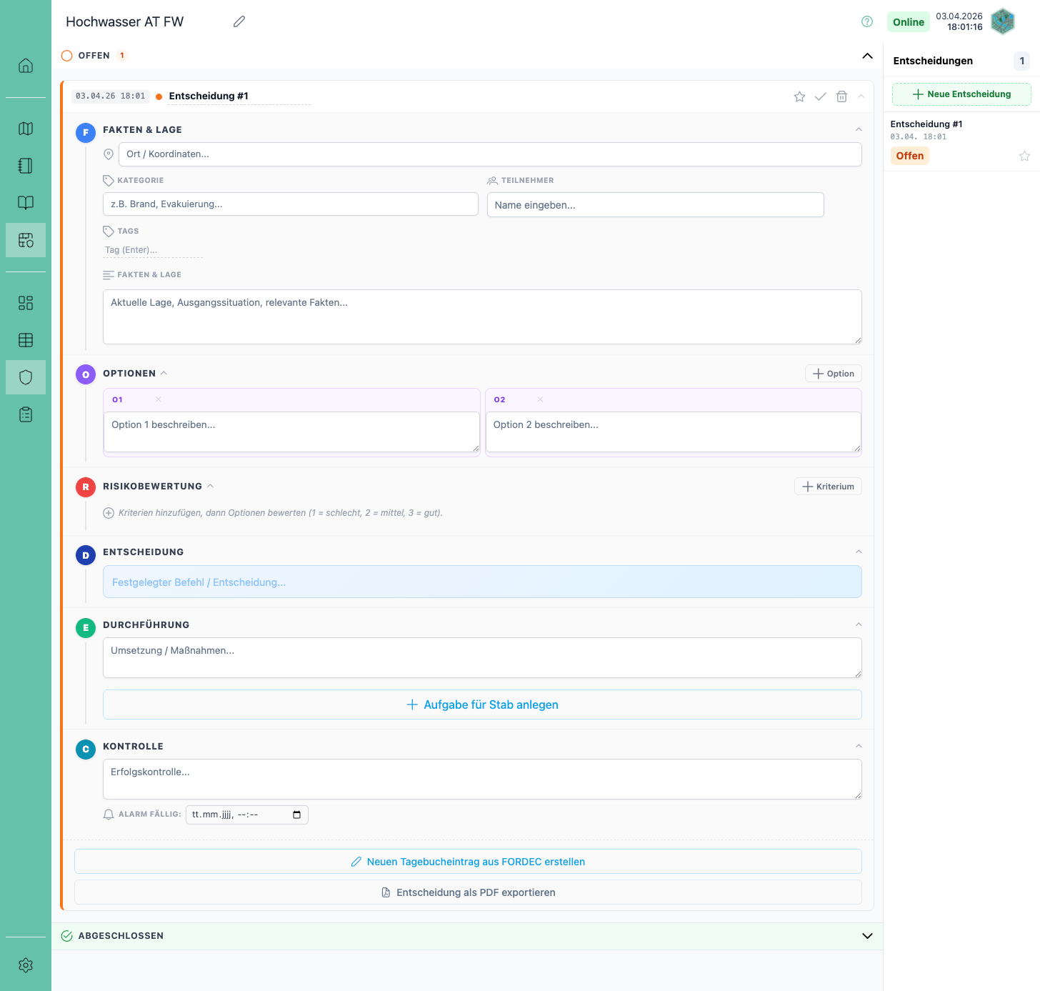 - Neuen Tagebucheintrag aus FORDEC erstellen: Überträgt die Entscheidung in das Einsatztagebuch, wo sie noch angepasst werden kann