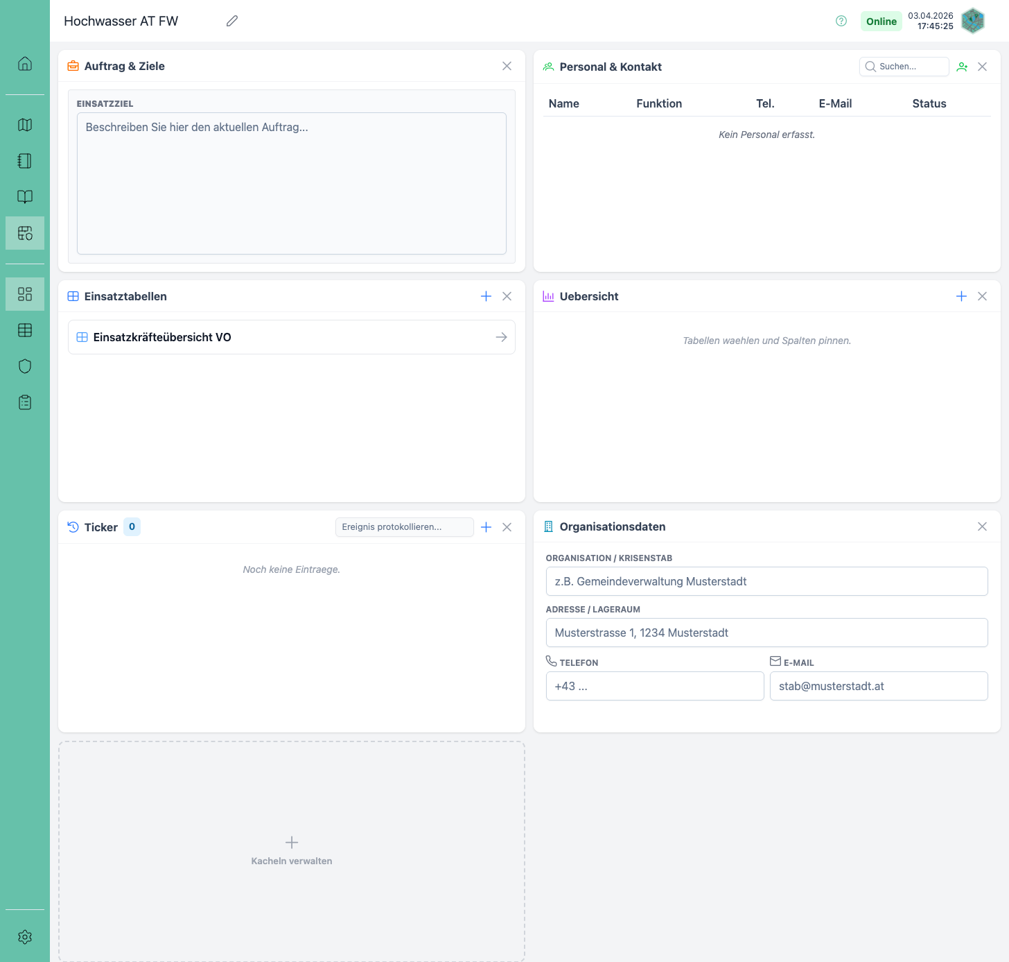 Abschnitt mit dem Titel „Dashboard“Das Dashboard ist die zentrale Übersichtsseite eines aktiven Einsatzes. Es bietet eine modulare, kachelbasierte Oberfläche, auf der alle wesentlichen Einsatzinformationen auf einen Blick erfasst und bearbeitet werden können. Die Kacheln können je nach Bedarf ein- und ausgeblendet werden.