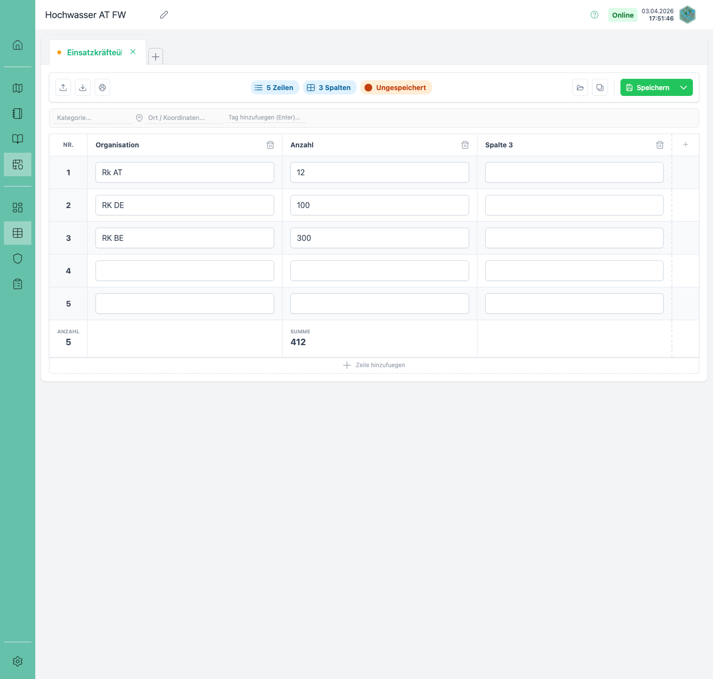 Das Modul Tabellen ermöglicht die einsatzbezogene Erfassung und Auswertung strukturierter Daten in frei konfigurierbaren Tabellen. Mehrere Tabellen können gleichzeitig geöffnet und über Tabs verwaltet werden.